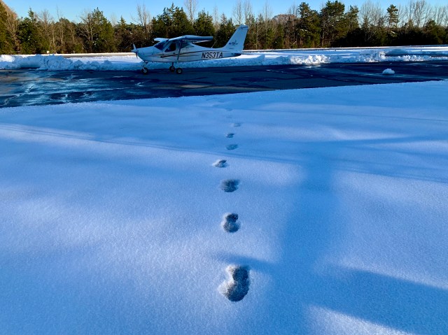 Chase City Municipal Airport had a black runway (thank goodness) so we landed and I went in to get a stamp. There was no one at the airport – I don’t know who plowed it – but I went in and got my passport stamped. The stamp is always inside. After I stamped my passport I turned around to go back to the plane. I took this picture before I made a second set of footprints heading back out to the plane: