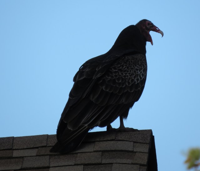 Tuesday evening when the dogs and I went for a walk we saw a squirrel in the street that had gotten hit by a car. Wednesday when I was coming home a turkey vulture was cleaning it up. It must have gotten full and it hopped up on my neighbor’s roof and yawned. I’ll put a picture of that first. After that I’ll put a picture of the vulture cleaning the squirrel. Some people may be un-fond of that image so I’m giving you advance notice. But it’s not particularly gory. Oak leaves take energy from the sun and make acorns. Squirrels eat that energy and become a different form of energy. Then if the squirrel gets hit by a car, a vulture comes down and turns the squirrel into yet another form of energy. Sunlight > oak leaves > acorns > squirrel > vulture. Who knows where it will go next. “The first law of thermodynamics, also known as Law of Conservation of Energy, states that energy can neither be created nor destroyed; energy can only be transferred or changed from one form to another.”