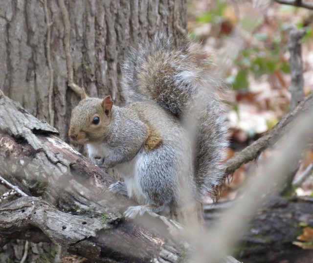 Just a few feet down the path I saw six gray squirrels at one time! If you’d drawn a 50′ x 50′ square in the air, a big frame, they would have all fit inside it. Plus there were probably more on the backs of the trees. I don’t know why or how that happened. Forget about photographing it – I don’t think it’s possible. Here is one of them; again a marginal image: