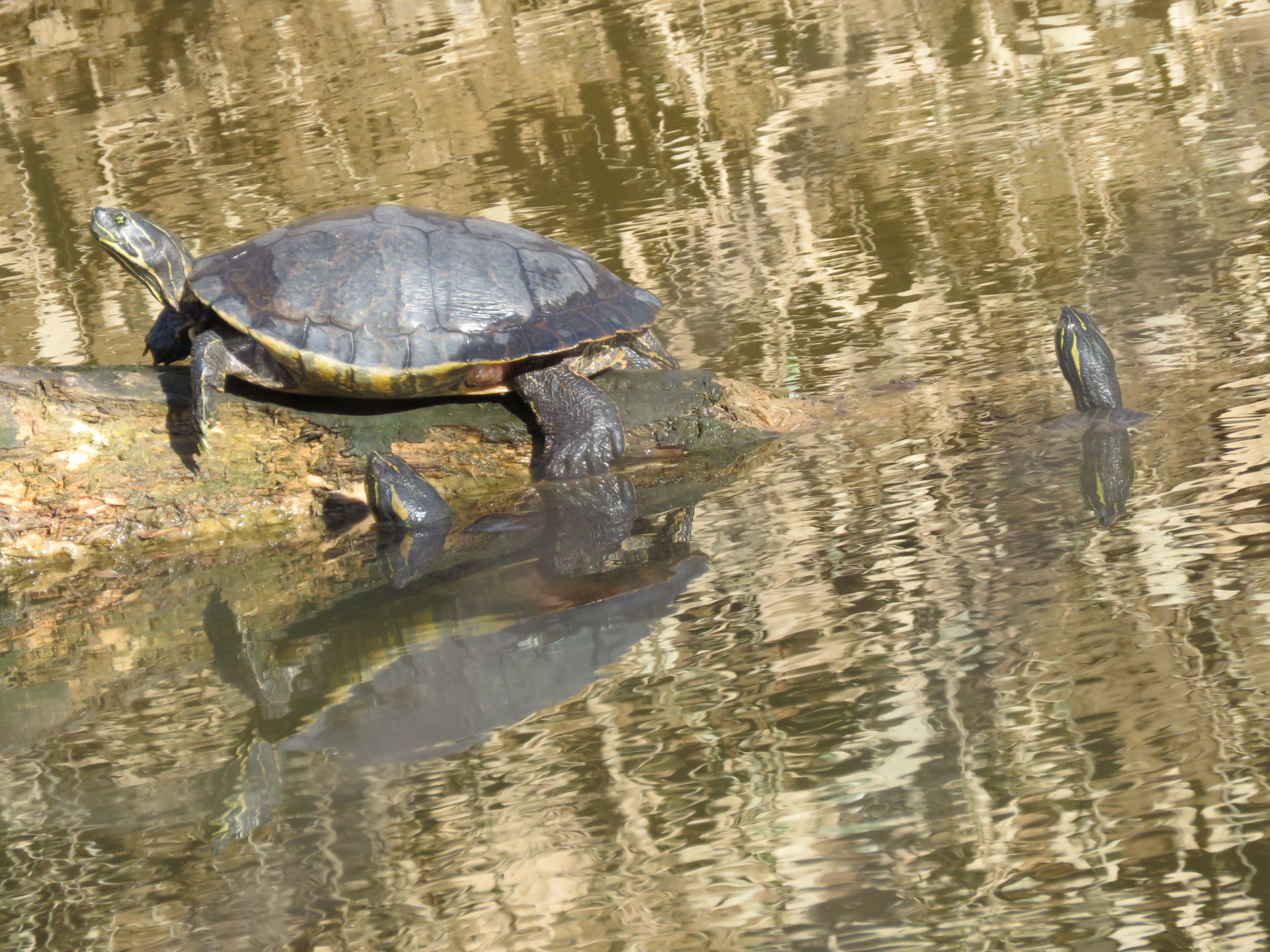 Two male turtles in the water, courting this female on the log