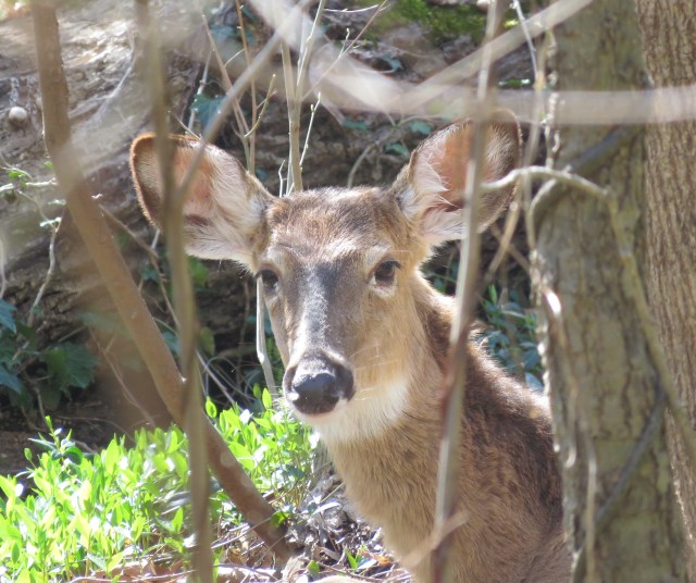 I hadn’t been seeing much in the way of deer at Pony Pasture recently, but there was one lying quietly in the woods today when we were on our return walk. This deer was lying down watching us for a long time when we first got there. The dogs were unconcerned. She (possibly a he with no antlers, but I think it’s a she) was also unconcerned. But eventually she stood up. I took pictures for more than ten minutes and she never left. She watched, watched, watched, but didn’t waste valuable energy (calories) moving away from a threat the didn’t exist: