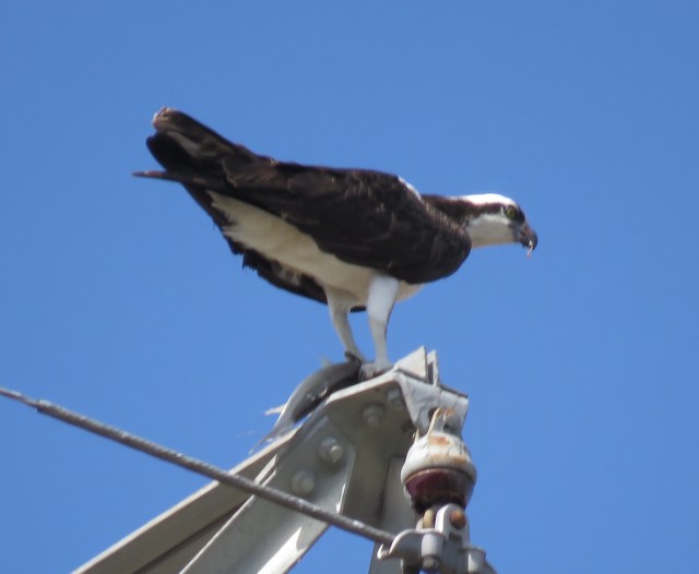 I noted my first osprey sighting of 2019 in last week’s only marginally coherent blog post, Incoherent. Barring something completely unexpected, there will be ospreys on that nest until at least August. I wish I knew the timeline for an osprey nest. They returned last week and I presume made the nest ready for eggs. I also presume the pair have mated. I think that’s roughly step two, and step three is laying eggs. The Cornell Lab of Ornithology is my favorite birding resource and they have a detailed page for every bird. Or at least every bird in North America. On the osprey page under “eggs” it says “Egg-Laying Generally soon (1–3 d, sometimes longer) after nest takes shape and nest-lining added.” So presumably there are eggs on that nest. It goes on to say that the average incubation period is 37 days, or slightly over five weeks. I first saw them on 3/13. That means there might reasonably be eggs hatching by the week beginning 4/15. I was surprised to learn it takes them 50 – 55 days (seven or eight weeks) to fledge after hatching. So they’d be flying off that nest – we’ll see – between about June 5 and June 12. But if they hatch on 4/15 (as I’m guessing), I think it’ll be at least a week before I can see their heads above the edge of the nest from the ground. Might be closer to 5/1. I’ll watch – this is fun already.