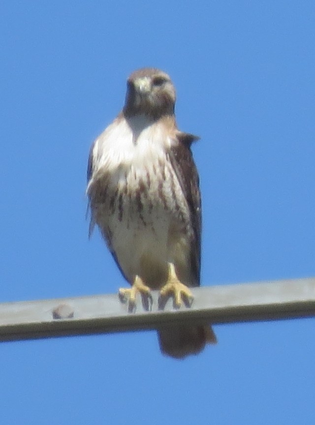 I took the last picture of her at 1:03 then walked back to the car and loaded up – that takes a decent amount of time. But it was precisely 31 minutes later, at 1:34, when I took my first picture (today) of a male Red-tail on a tower near my house. His crop (stomach) was full; he was just going to enjoy the sun and view for a while. He probably has to bring food back to his mate – assuming she’s on the nest with eggs. Though I have no idea where their nest is. He’s a handsome guy though. I got greedy and zoomed in from too long a distance; this picture is a little grainy: