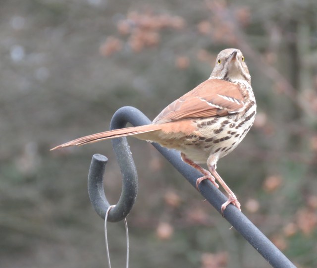 Brown thrasher on the feeder – not their normal haunts