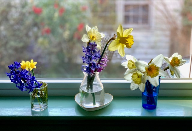 Before I send you off with my fun experience with Mark this week, I’ll close the pictures with one I took of a flower display Ev created in our mostly south facing kitchen windowsill. If you’re talking about a plant that can compete with a gardenia in the smell category, hyacinths are certainly in that conversation. Evelyn cut all these from our yard. The hyacinths are purple. The others are samples of the wide variety of daffodils Evelyn has blooming all over our yard: