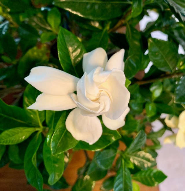 That camellia at the top of this post is a bright, cheerful, fun loving (appearing) flower, but they don’t have much scent. I’ve seen outdoor gardenias bloom before – there will be some on the side of Cary street near Fresca soon – but ours for the time being are indoors. This smell is first in line in the “flowers that smell outstanding” category; there are not enough superlatives to do justice to gardenias: