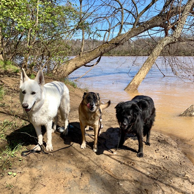 It was ~55º and sunny with a soft breeze; Mackey and Turner and Yuki would have it that way every day if they could. Pony Pasture’s northern boundary is the river and its eastern boundary is the creek that separates it from the Willow Oaks Country Club golf course. So there’s a muddy, shaded little beach right there at the northeast corner. It’s roughly the half way mark on our walk and we like to take a little break there when it’s not too flooded. In this picture, if Mackey looked to his left across the creek, he’d be able to see the cart path up the hill, and behind it the green for the four hundred yard par four fourth hole. But I’m a dog person not a golf person, so here are the boys this morning: