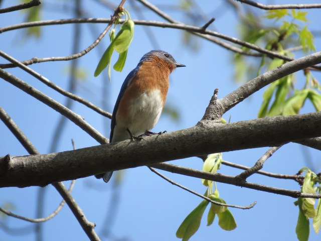 This adult male bluebird posed obligingly at Pony Pasture this morning when the dogs and I sauntered past. I was fortunate to see him in good light perched on this maple tree over the water: