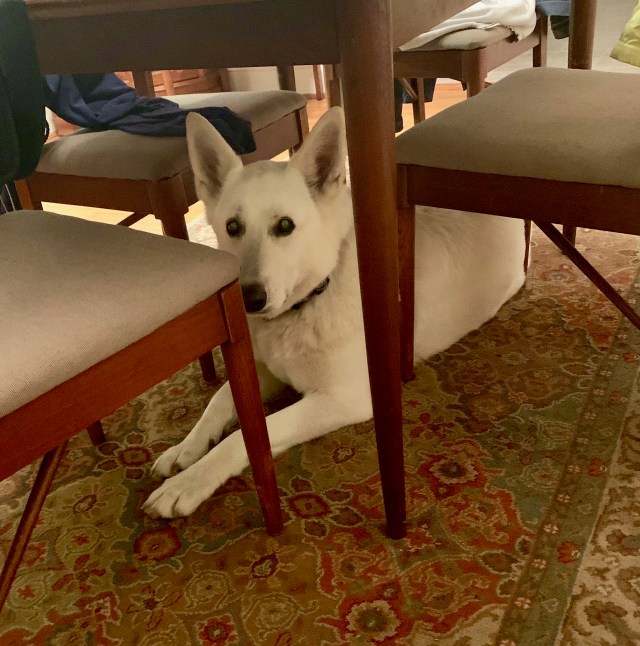 Yuki came over to visit on Wednesday. His favorite place in our whole house – every time he comes over – is under our dining room table. It’s his own little “fort”:
