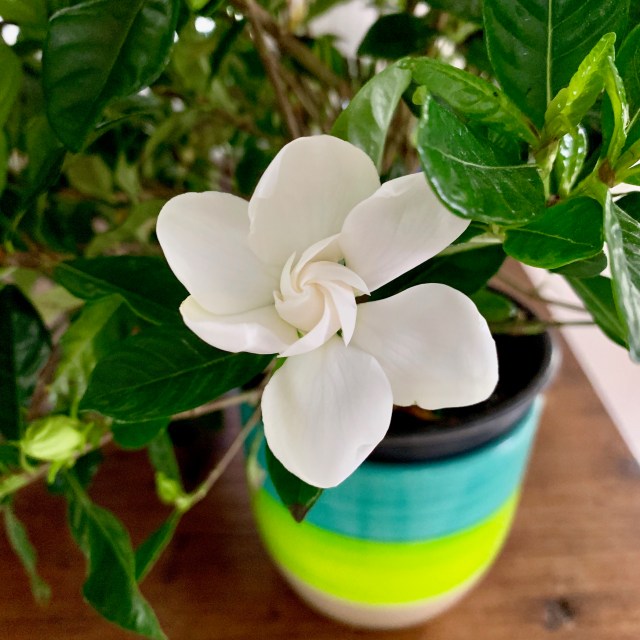 Ev was away this week (she got home this evening, thank goodness) but she gave me careful instructions on taking care of our gardenia: one cup of water per day. It worked! It bloomed twice while she was gone! Here’s a beauty: