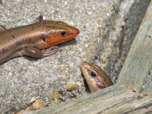 It’s tempting (to me, anyway) to describe animal expressions in human terms. But interpreting cardinal expressions or skink expressions through the lens of a human mind is bound to be inaccurate. But he looks quizzical: