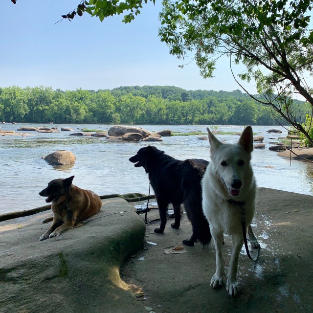 I took a moderate picture of my current dogs at the river this morning. Turner lying down – we’d just gotten there! – Mackey facing upstream, Yuki facing me. You are looking at three wonderful boys right there: