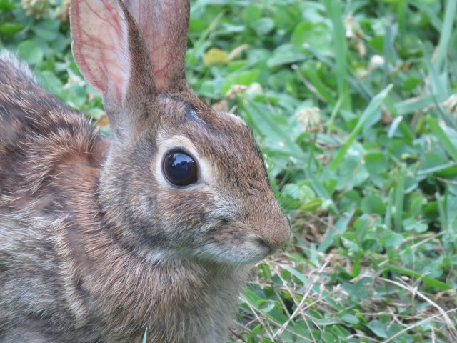 Also (I can’t seem to finish this blog post) Evelyn was leaving for work Thursday evening and she stopped on the edge of the front stoop and found someone grazing on our lush and fragrant clover!: