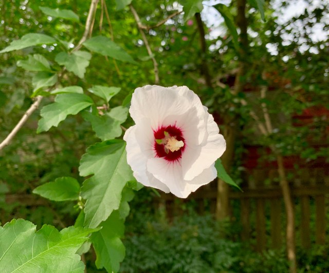 As summer sets in, our Rose of Sharon is blooming vigorously in a corner of our backyard. There were dozens and dozens of buds on the ground. Plus I couldn’t really get a good angle, but there is a purple Rose of Sharon this prolific or more. I just couldn’t get into a good spot. But check out this beauty: