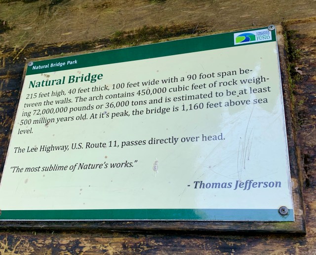 There’s a song – true story – by They Might Be Giants called She’s Actual Size. The first line of the chorus is “She’s actual size, but she seems much bigger to me.” That’s as precise a description as any other about the way I felt when I saw the Natural Bridge – “it’s actual size, but it seems much bigger to me.”