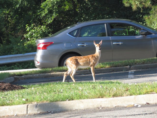 Yuki’s taking a little summer break so Mackey and Turner and I are going to the river on the early side to avoid the heat. We arrived at the intersection of River Road and Huguenot Road and this doe and fawn were ambling across the parking lot near BB&T and headed across Huguenot Road toward Schwarzchild jeweler (6000 River Road). I took five  pictures in under two minutes. Both deer got around the guard rail and into the woods. They’re safe in there; it probably takes them ~2 minutes to cross the train tracks and get to the river’s edge. I snapped this picture with my phone (in the parking lot) when I first caught a glimpse: