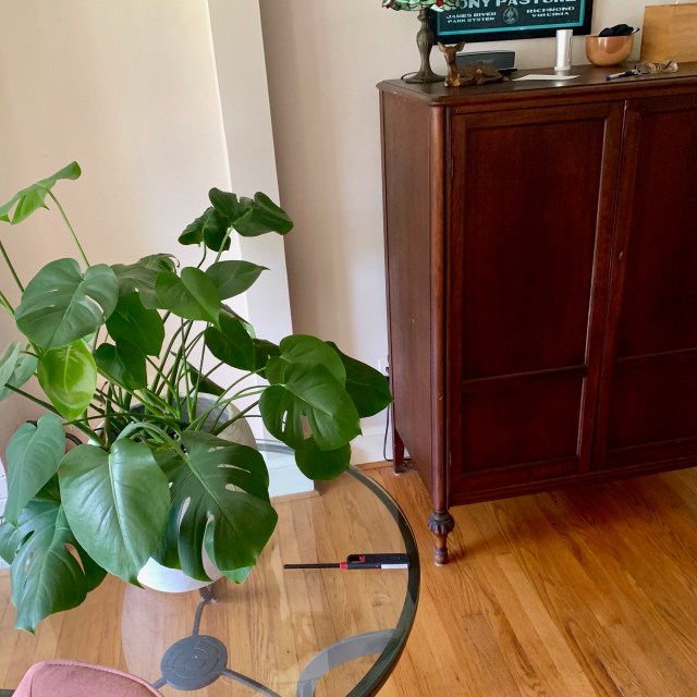 I’m just going to wrap up with a couple pictures of shadows in our living room. When the dogs were at the groomers Tuesday – I am not making this up – the sun shone through our living room window through the leaves of this lush philodendron. I regret not photographing the sun on the leaves: