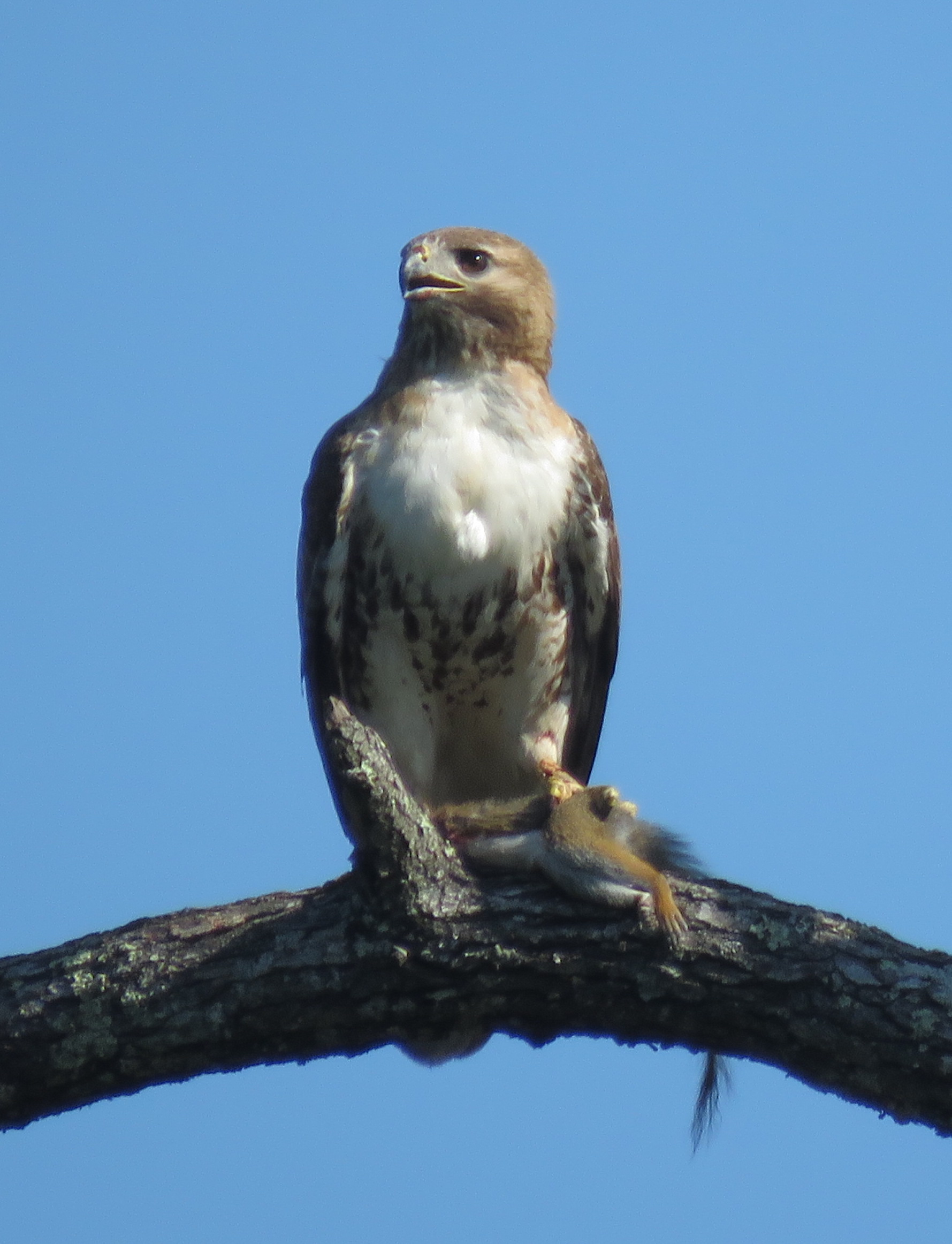 Red tailed hawk with gray squirrel about to become breakfast