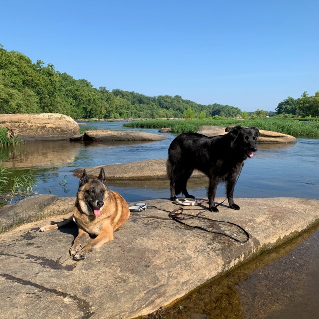 Yuki didn’t join us on our walk this morning, but aside from that glaring omission, our hike at the river this morning could not be improved. Look at Mackey and Turner on a rock just as we arrived at Pony Pasture this morning: