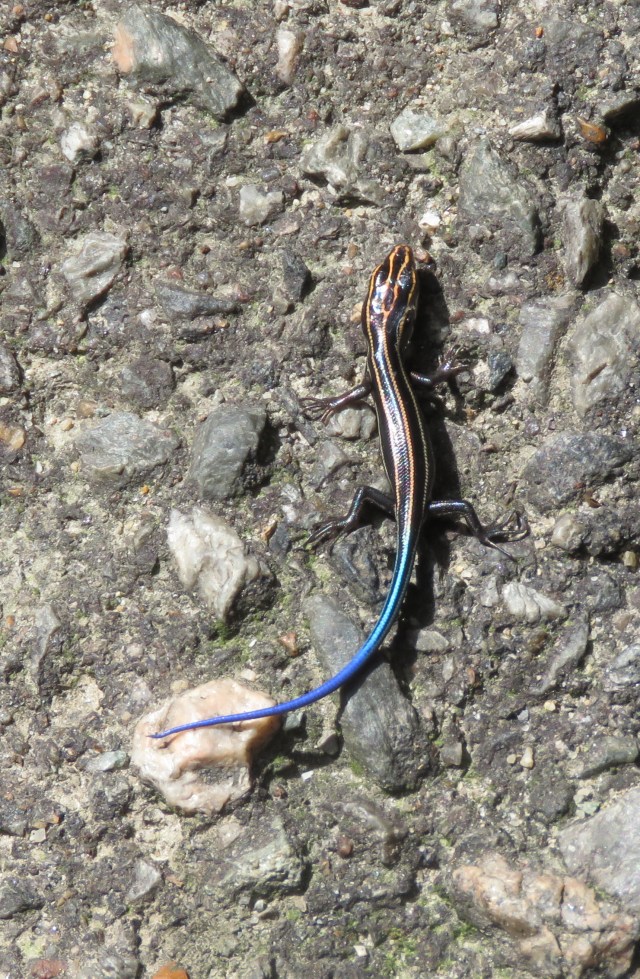 I saw a nice young skink later that day at Deep Run. This is a youngster as you can tell from the blue tail. It was also tiny. Just a miniature skink. I tried to put my pen down for scale but this little being was moving real, real quick in that bright morning sun: