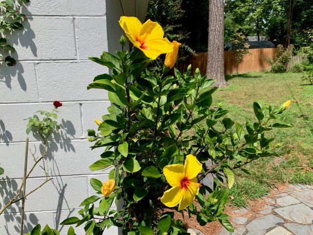 A hibiscus within a short branch length of the rose. There’s nothing subtle or mysterious or hesitant about a hibiscus. Very welcoming. Flowers to the best of my knowledge do not have emotions. But it’s difficult not to look at this and feel cheerful: