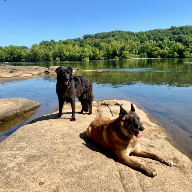 I took this picture of Mackey and Turner at the river this morning. With my phone! We were farther down the river than normal. Look at Mackey shining! He is a handsome, elegant, graceful boy. Turner is too, of course, but he arrives at the destination of handsome elegant grace by a much different path than Mackey. In a manner of speaking: