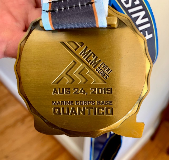 We swam 750 meters (half a mile) in the Potomac River, then rode our bikes 20 kilometers (~12.4 miles) around the base. We finished with a wooded 5k (3.1 mile) run on the physical fitness course.