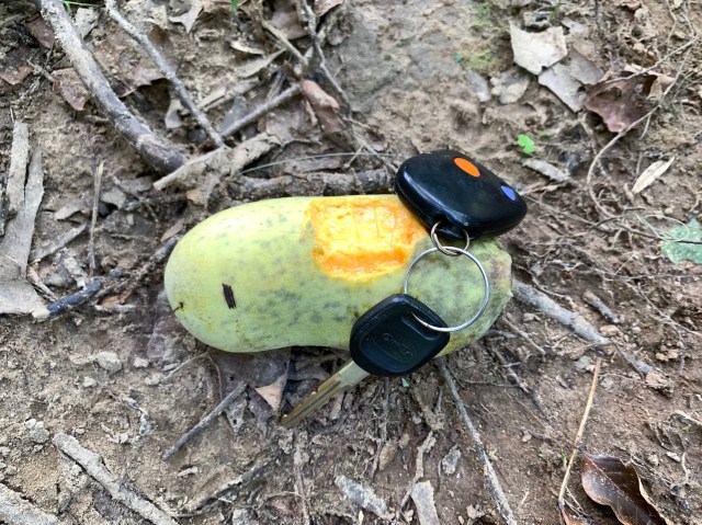 Speaking of Pony Pasture, a friend recently asked how big pawpaws are. They’re the size of an Idaho baking potato. And their skin is a pale, gentle, almost translucent shade of green. I described the skin in last week’s blog post as so soft that it was possible “a falling chickadee feather would poke a hole in it.” I’ve also (because of that soft skin) often said that a pawpaw is perfectly ripe between the time it falls from a branch and the time it hits the ground. If you’re fortunate enough to be standing under a pawpaw tree with your catcher’s mitt at that precise instant, you’re in for a real treat. I would imagine. I’ve always been too late and had to pick them up off the ground and eat them. They are fantastic then. Here’s one I saw this morning, shortly after I took a bite, with car keys for scale. It was between 45 and 90 minutes overripe, so it was a tiny bit sweeter and softer than perfection, but only a tiny bit:
