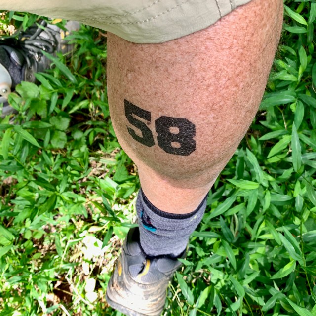 Speaking of the world turning, I had a birthday Friday. I did a triathlon the following (yesterday) morning in Quantico, VA. They tattoo (a sticker that stays on for ~a week) your age on your calf so we know one another’s age when we’re passing or being passed. Both happened to me many times. Here’s what my fellow athletes saw. I took this picture this morning at the river: