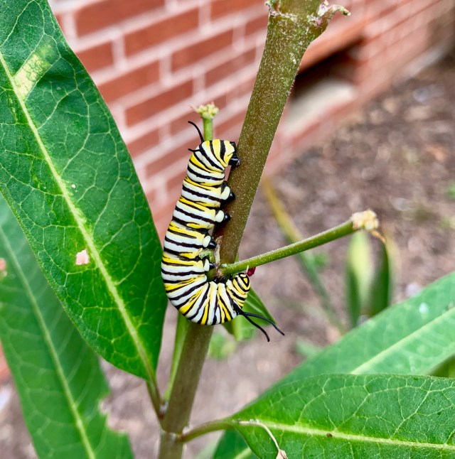 Since I’m fascinated with this stuff (indulge me, please) I’m posting a comparison picture of a milkweed caterpillar (Monarch butterfly caterpillar) for comparison. Note the differences and similarities; they’re subtle but (IMO) unmistakable: