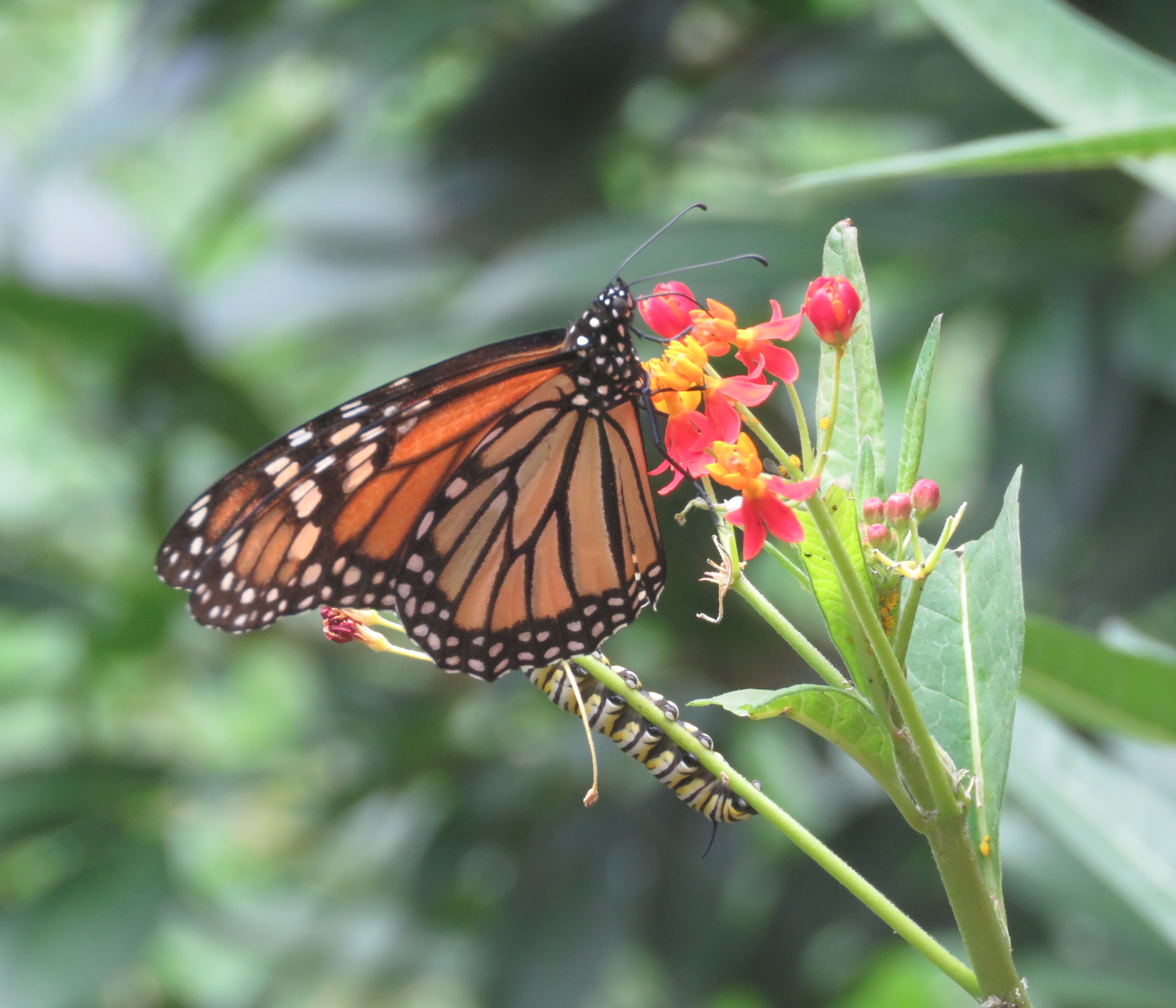 Monarch butterfly in foreground, caterpillar behind