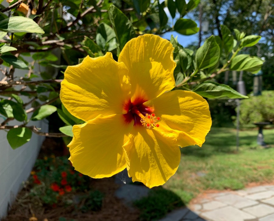 One of Evelyn’s prolific backyard hibiscus flowers, around noon today