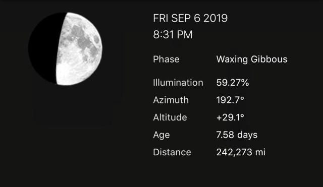 Here’s another picture from this week. Sunset is more than an hour earlier than it was in June, so moon photography is getting easier and easier. The sun set at 8:35 on June 21; tomorrow it will set at 7:27. It’s a lot easier to get moon shots when it’s dark so early. This will be more than a little bit geeky; if you find yourself falling asleep, don’t hesitate to skip ahead to something hopefully more interesting. But Friday night I took two pictures of the moon, one at 8:30 and the following at 9:30. You can see the slight change in angle. I also have an astronomy app that gives more detailed data. So I’ll add that data beneath each image: