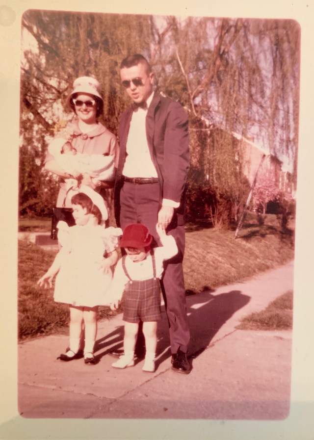 My handwriting has always been illegible, similar to my father’s. But mom wrote in that graceful, elegant hand until it started to get away from her a little in her mid-seventies. I’m not sure when she wrote that, but it was a long time ago. I’m wearing a stylish red cap, plaid shorts and suspenders, a white long-sleeved shirt and white shoes. I was just over eighteen months old. Katie’s next to me, and mom is holding Sheila, who was not yet two months old. Mom was twenty-six years old in that picture. Dad was twenty-seven. Kevin and Shane were still a couple of years in the future. Sadly missing here – a story I may share at some point – is our sister Anne Michele, who was born on a pretty September day in 1960 but lived for only a week.