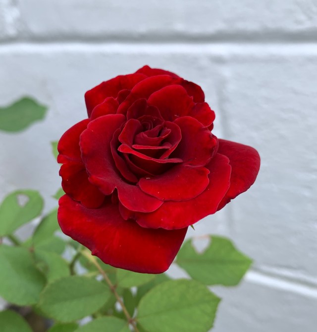 A quick break. For one of Evelyn’s breathtaking roses. These roses were well established when I moved to this house eighteen years ago (!). You know they’re tough plants because they survived my neglect – it was thorough – until Evelyn moved here in 2012. Our friend Judith tells us this is a Don Juan rose and that requires a lot of attention. I took this picture next to the garage Thursday evening near dog feeding time (5:30):
