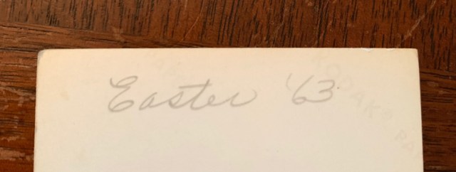 I was looking through my pictures for the week – I have some nice ones – working on a theme. I was “casting about” for a theme. I looked to my right on my desk and, inexplicably, that picture was lying under my right elbow. There were many others of a similar vintage but that one was on top. This is what it said on the back: