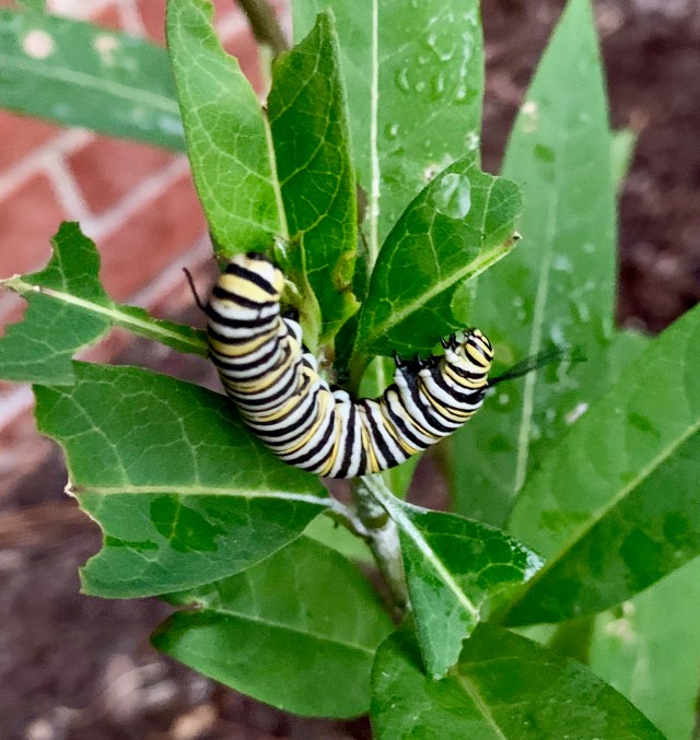 PS The latest sunset of the summer was 8:35. Tonight it set at 7:18. I’m having a difficult time with the light! We’d been out and just walked in the house when Evelyn told me there were new Monarch Butterfly caterpillars on the flowers out front. One looks pretty much like another, but I don’t get tired of them. I’m sorry if you do! But I took this picture at 7:20 this evening: