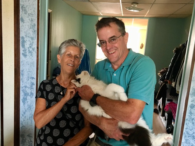 This is Evelyn and me with Aileen’s cat Pancake – who stood in for Mackey and Dash and Turner while we were away from home. I think I’ve met Pancake maybe once, years ago, or possibly never. I know Evelyn has never met him. But when we walked in the apartment he greeted us in a manner that suggested perhaps he’d been waiting his whole life for the privilege. The friendliest cat ever:
