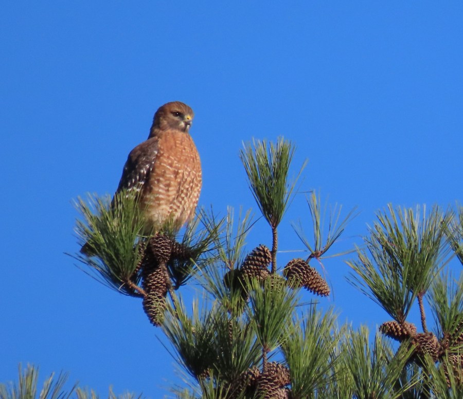 Red-shouldered hawk perched in a loblolly pine in front of a crisp blue sky