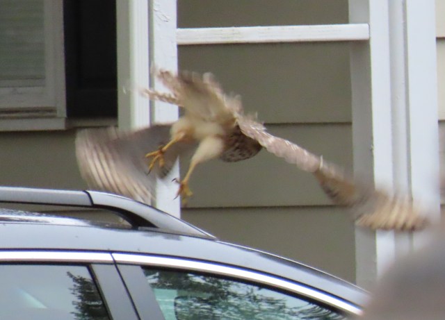 Back to the “Birdbrain” part of this blog post. The chickadees on our street might do that (perch on my arm) after a lot of effort, though I’ve not yet been fortunate enough to have it happen. A wren has perched on the steering wheel of my car (I took its picture) but not on my shoulders. Hawks on our street, zero percent chance. This one was directly across from our house Tuesday morning at around 10:00. Probably looking for a little early Halloween treat scurrying around down there in the ivy: