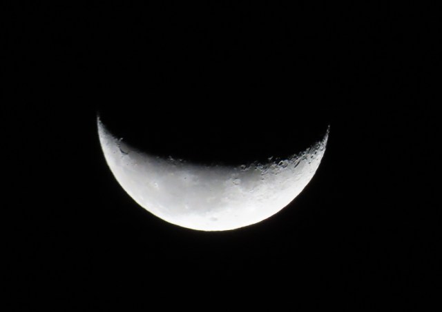 The moon will be “new” (100% invisible) tonight at 11:40. Which means it’s invisible now, no matter how clear the sky is, and it’ll be invisible tomorrow too. But I took this first picture at 6:48 Wednesday morning when it was 29% full and slowly shrinking (waning):