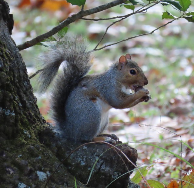 I saw the white squirrel at Deep Run later on Monday. And again later this week. I’m wondering if there is more than one at Deep Run. If not, this one covers a lot of ground. I’ve seen it across a wide area of the park. Squirrels are gathering nuts everywhere right now. The days are getting shorter and shorter and the average temperature is slowly drifting down. Here’s the white squirrel (or a white squirrel) gathering nuts this week at Deep Run Park and Recreation Center