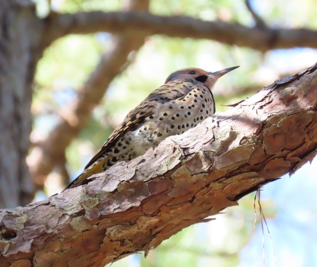 I also glimpsed a Northern Flicker (Colaptes auratus) on a tall pine this week. On my next picture (this coming week if I’m lucky) I’ll post a clearer image. But they’re nice looking birds and I always smile when I spot one: