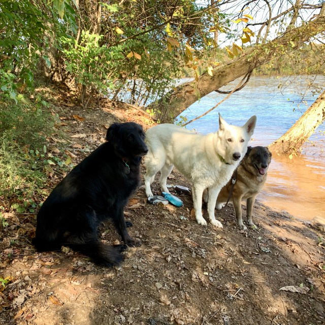 Mackey on the left, Yuki in the middle, Turner on the right next to the muddy James River this morning at Pony Pasture