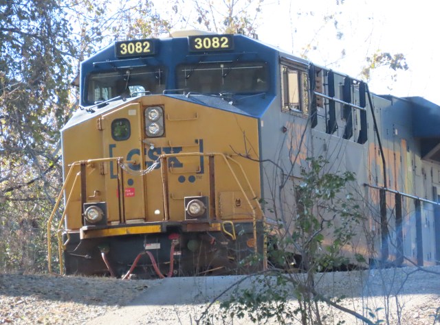 Also note the CSX coal train heading east behind us. If we’d all looked to our left, we could see the spot where my friend Clark and I look for trains nearly every week. Clark and I were down there Wednesday afternoon around 1:30. This locomotive, CSX #3082, a GE ES44AC, was pulling an identical train in the same direction, three days earlier: