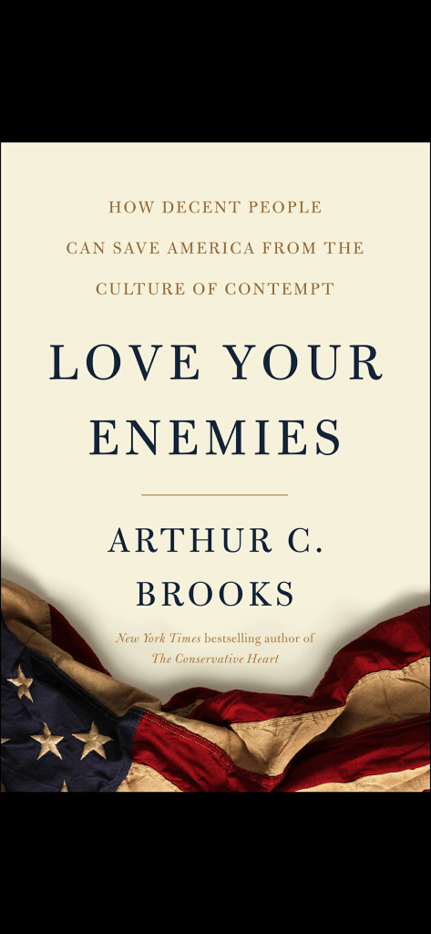 I need to write about this book, I recently finished it and it was a pleasure from start to finish. Arthur C Brooks was even handed and non-partisan in a manner that has become very difficult (at least for me) to find lately. Here’s a link to the goodreads (not Amazon) page for Love Your Enemies: How Decent People Can Save America from the Culture of Contempt by Arthur C. Brooks. It’s a refreshing read. Here’s the cover: