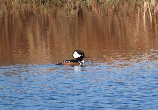 Half an hour before I saw that hawk I saw a handful of Hooded Mergansers (Lophodytes cucullatus) on the lake. Hooded Mergansers also eat living beings, as it says under Cornell’s “basic description.” Their exact words are that it eats “fish, crayfish, and other food, seizing it in their thin, serrated bills.” Compared to the hawk eating the owl, that seems like nothing at all. It’s interesting (maybe it’s just me) that we feel real sad about a bird eating a baby bird, but we don’t even blink when we read about a bird eating a fish or a crayfish. Here’s a male Hooded Merganser from Thursday: