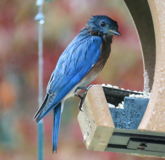 We are seeing many pairs of bluebirds on our feeders currently. This one was out in the rain earlier this afternoon. Their colors aren’t bright in December, and the light is poor, and it’s wet, but I believe this is a male: