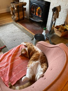 Okay – I’m going to wrap this up. These will provide some contrast with the fast moving bluebirds and gulls. I took all four of these this week – in front of our woodstove. I titled this email “no rush”: