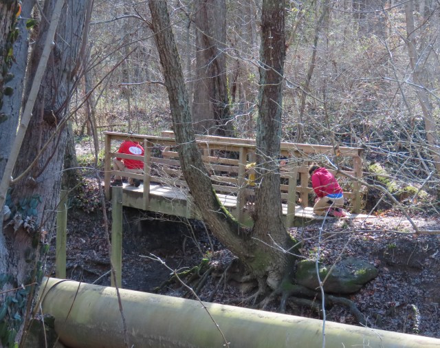 But – we got a bit further down the trail and met a volunteer crew busy cleaning debris and leaf litter out of the spaces between the boards on the big footbridge across the creek. I was showing them the owl picture because 100% of people are interested (or fake like they’re interested) in a picture of a pair of owls. And after they looked at the pictures – they loved them – they said “we’re flossing the bridge!”: